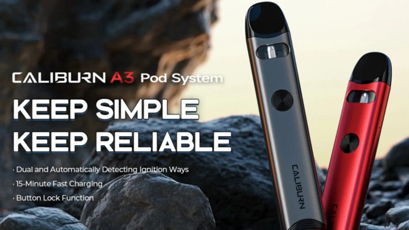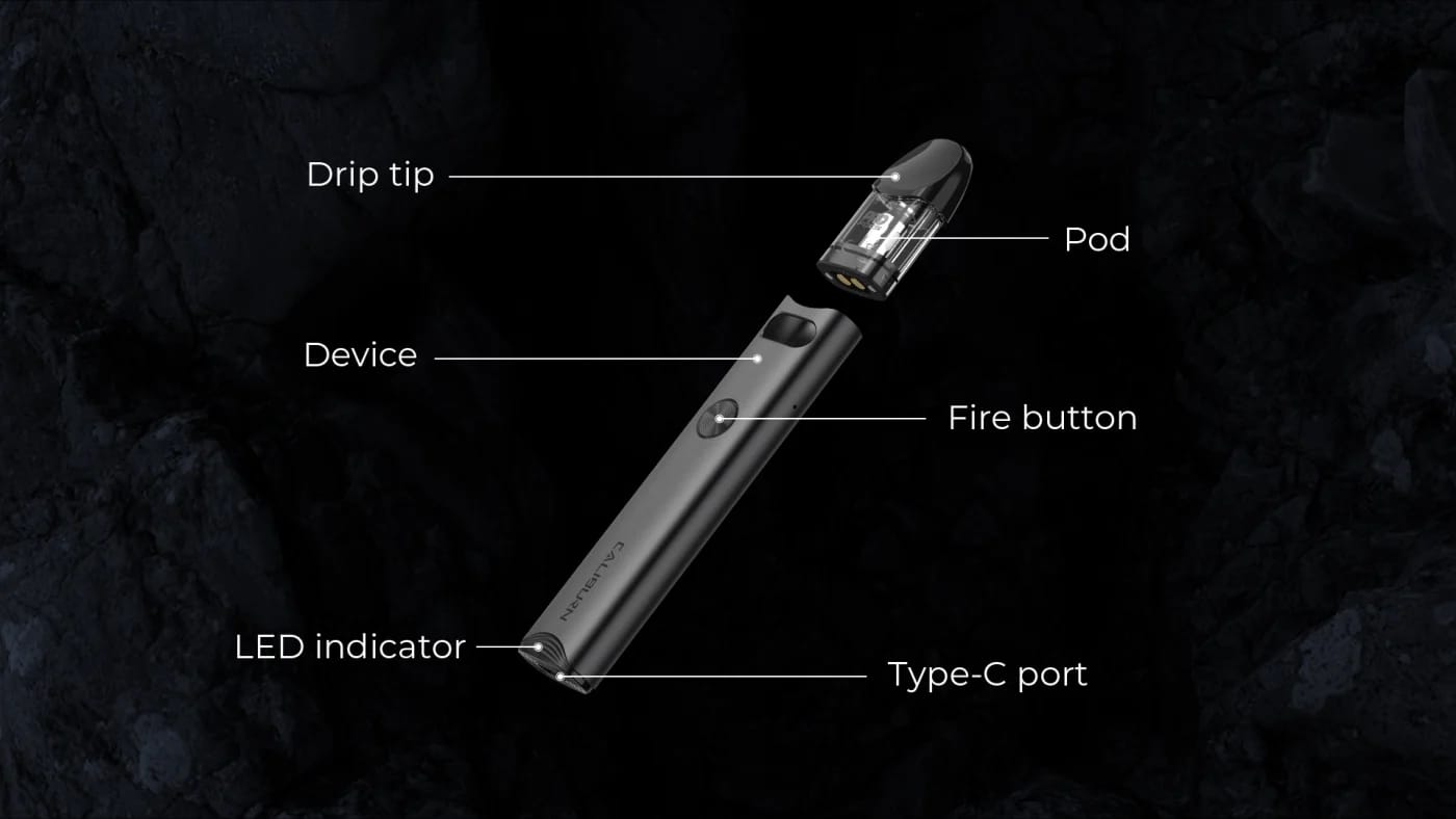 Caliburn A3 Pod Kit 520 mAh battery with 1 Ohm cartridge featuring a meshed coil, a Type-C port, and a 2 ml top refilling pod, CALIBURN A3 is an ideal pod for flavorful vapor. Its transparent pod is unique and elegant.